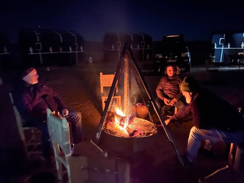 Pas de réseau sauf au sommet de la dune, ça ne fera pas de mal. Nous déchargeons le 4x4 du matelas humanitaire amené par Cathy et Christophe. Nous profitons de la chaleur, du paysage magnifique, et réparons une pompe pour la réserve d’eau. Nous enlevons tout sur les motos en prévision du lendemain. Le soir est déjà là. Douche avec le cumulus au bois et barbecue, chamallows.