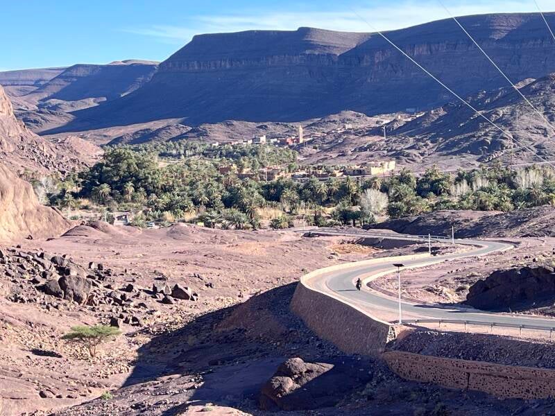 Ça y est nous quittons les bivouac vers Foum Zguid. Cette fois les motos sont allégées au max. Toute la bagagerie est dans le 4x4 de Cathy et Christophe qui vous faire l'aller retour. C'est nettement mieux, les lecons d'hier portent leurs fruits. La piste nous semble moins piégeuse. Deux heures après nous sommes à Foum. Déjeuner d'adieu et nous partons juste les 2 motos vers le bivouac des aigles à l'oasis de Fint. La route est sublime entre les deux chaînes de montagnes. Les couleurs passent du vert au noir en passant par le rouge. Le bivouac ressemble à un havre de paix.
